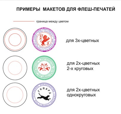 В многоцветных красконаполненных печатях лучше использовать два-три цвета - это оптимальное количество. Технология создания флэш-печатей обеспечивает сохранение каждого цвета в конкретном поле печати, поэтому не стоит бояться того, что цвета вашей печати вдруг смешаются. Есть варианты красконаполненных печатей, для которых цвета смешивают целенаправленно, т.к. сказать, с умыслом, желая сделать ее наиболее защищенной. Такую печать невозможно подделать.